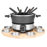 With practical parking deck for keeping warm or for storing unused pans. Can be used individually or combined. For grilling and baking, for cheese, meat, vegetable and chocolate fondue. Raclette from 150°C – 280°C, fondue from 40°C – 180°C. Large ribbed grill plate with ceramic non-stick coating, removable. 9 non-stick raclette pans. Fondue pot Made of stainless steel, 1.0 litre with lid, dishwasher safe, includes 9 pans, 9 spatulas and 9 fondue forks